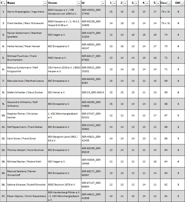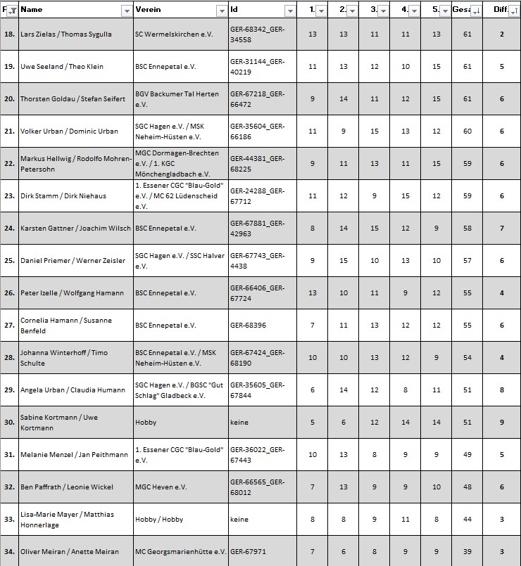 Beteiligung. Mit 75 Assen auf fünf Runden gewannen die letztjährigen zweiten Gerno Grapengeter und Ingo Arens die diesjährige Auflage des Team-Nachschlagturniers. Sie setzten sich im Stechen gegen Frank Seidler und Marc Wiesnewski durch. Diesen gelang als alleiniges Team eine „18“. Platz 3 ging an das Duo Rainer Gellermann und Manfred Spielfeld (74 Asse) gefolgt vom besten Ennepetaler-Team Heike und Peter Hensel mit 73 Assen. Den letzten Preisrang sicherten sich Michael Puschner und Frank Brunnenkant mit 72 Assen. Unter allen übrigen Teilnehmern wurden noch zwei „Lucky Looser“ ausgelost. Diese Preise gingen an Volker Urban und Dominic Urban sowie Manuel Seeland und Rainer Winterhoff.